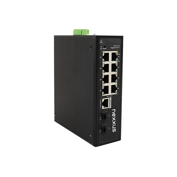 NXS-IES-8P2S-b is a 10-port Gigabit managed industrial bt PoE switch designed for high-power, high-density industrial networks. It features 8× Gigabit RJ45 bt PoE ports (up to 90W per port) and 2× Gigabit SFP uplink ports, supporting IEEE 802.3af/at/bt standards. The switch offers L2+ management, IPv4/IPv6 support, VLAN, QoS, ACL, ERPS (<20ms), and STP/RSTP/MSTP for reliable redundancy. Built with a rugged aluminum housing, wide temperature tolerance (-40°C to +80°C), dual DC power input, and DIN-rail mounting, it is ideal for transportation, power, mining, smart cities, surveillance, wireless APs, and industrial automation applications.